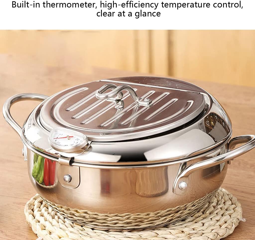 Frying Pot Fryer Pan With Thermometer Lid Stainless Steel Oil Drainer Wire Rack Kitchen Fried Cooking Tool and Features Multifunctional It features the functions of economize oil, spillage, filter oil conveniently and easily.Lid:Inclined clamshell pan cover with removable rack;Increase the rack food placement more convenient to fry High pot depth, high temperature thermometer, aging temperature control, can be or shallow, control.Stainless steel: The stainless steel pot body the pot cover, has the appearance more delicate, and is practical and Frying It can be used for fried chicken legs, dried fish, French fries, chicken Fry Pot only,other accessories in the picture is not included Specification Stainless SteelOptional Diameter: 01, 0201 Diameter: app.20cm/7.87in02 Diameter: app.24cm/9.44inColor: SilverQuantity: 1 PcNote:No retail package.Please allow 0-1cm error due to manual measurement. pls make sure you do not mind before you bid.Due to the difference between different monitors, the picture may not reflect the actual color of the item. Thank you!Package Contents:1 x Fry Pot